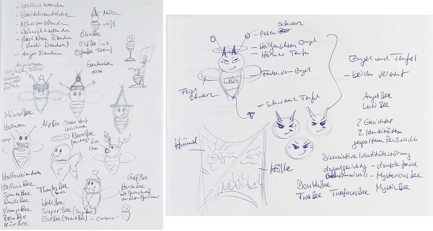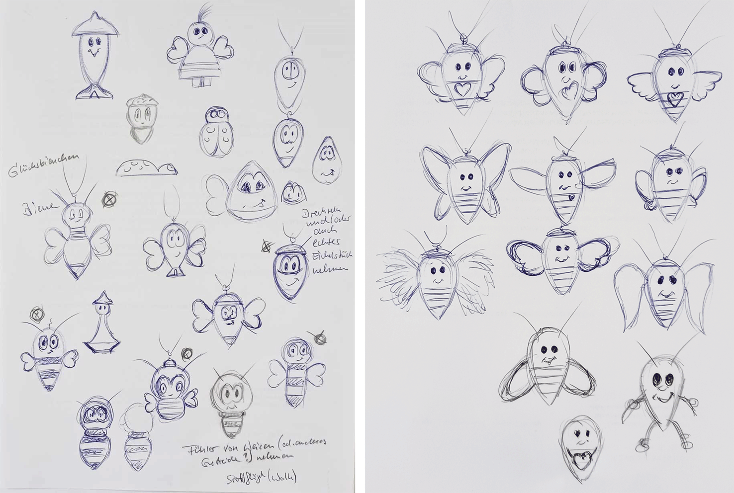 Erste Skizzen, aus denen sich zuerst die Tropfenform und später die typische Bienchenform entwickelte.